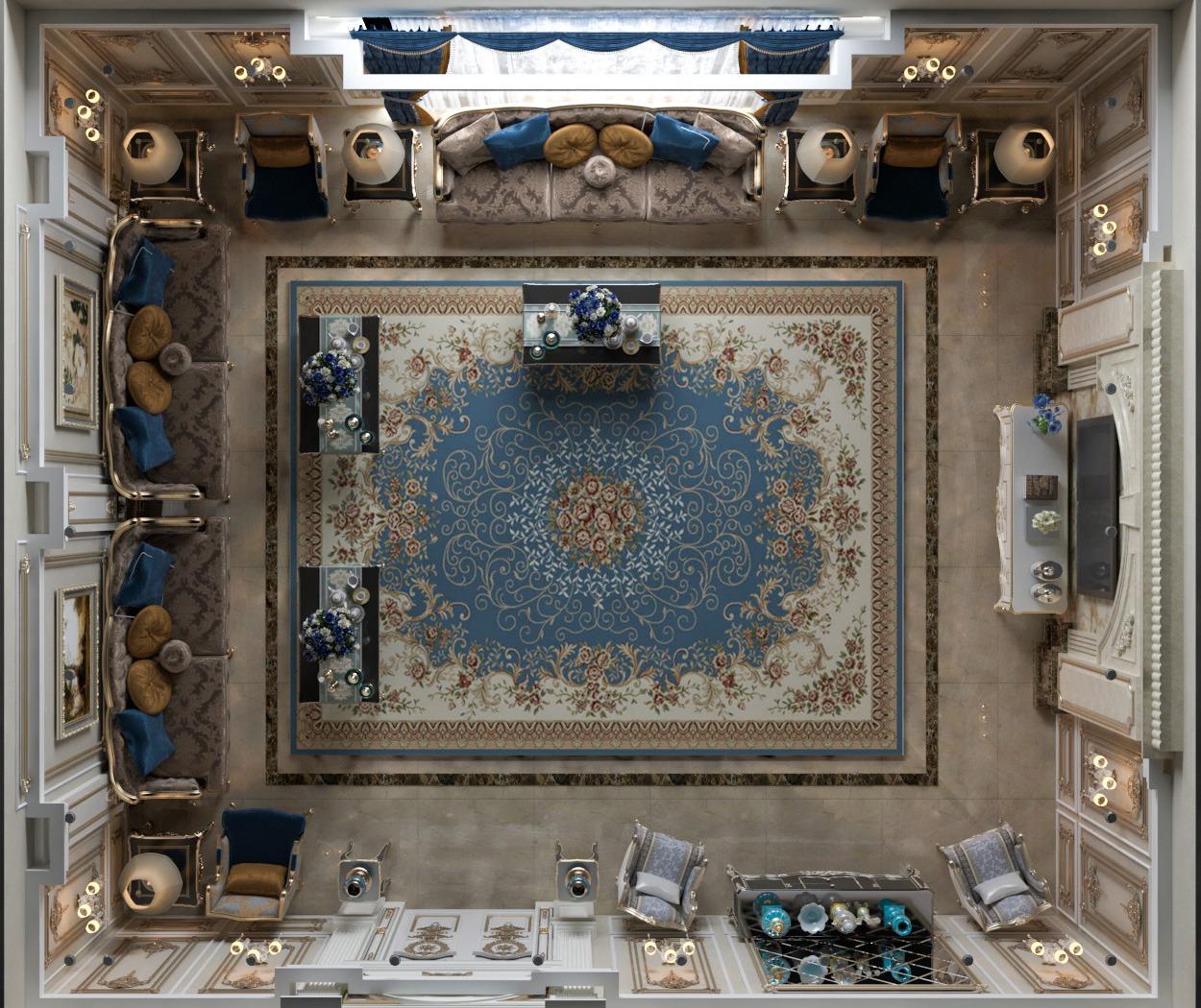 The design features intricately carved wall details, a decorated ceiling with crystal chandeliers, and lavish furniture upholstered in luxurious fabrics, with a harmonious color scheme blending gold and royal blue.